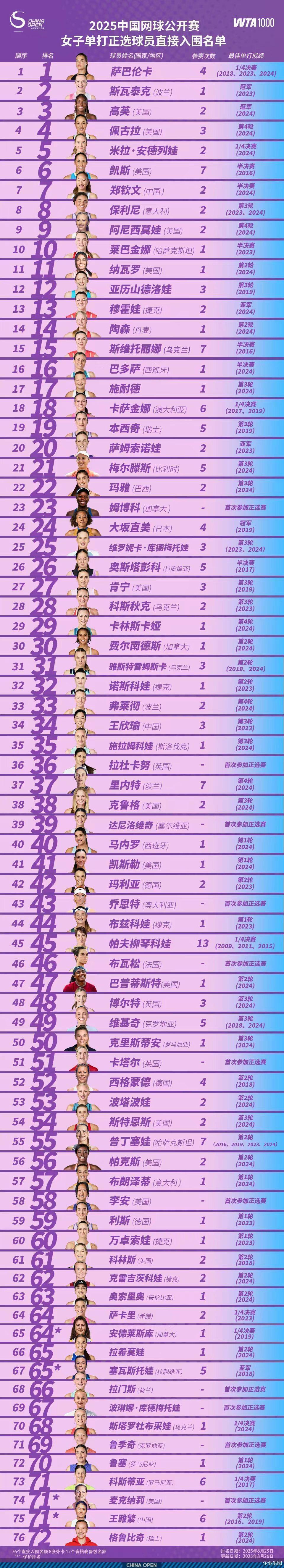 女子方面,中网去年扩充为96签后,女单正选入围名单达到76人,包括萨巴伦卡、高芙、斯瓦泰克、凯斯、莱巴金娜、大坂直美、奥斯塔彭科、肯宁、拉杜卡努、万卓索娃、克雷吉茨科娃和安德莱斯库12位大满贯女单冠军,其中斯瓦泰克、萨巴伦卡、大坂直美为3位先后登顶过世界第一的球后。中国军团方面,郑钦文、王欣瑜、王雅繁凭借排名直接入围。
